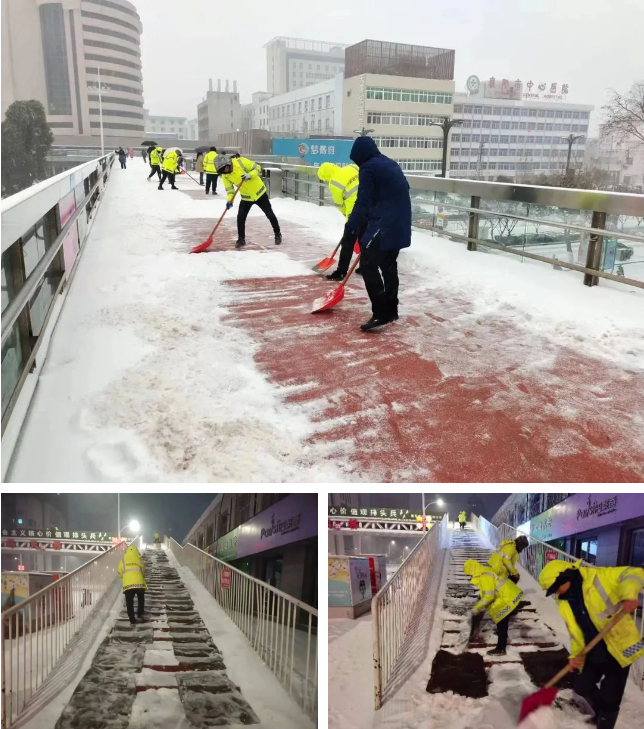 凍雨剛落,迅速安排人員融冰除雪,最大限度防止凍雨凝結(jié)成塊。2月20日晚上10點、12點,21日凌晨5點分別出動人員機械除冰除雪,其中市政管理處14支應(yīng)急隊伍共計272人趕至市區(qū)14座人行天橋,橋管中心6支應(yīng)急隊伍反復(fù)在大型橋梁上除冰除雪,建管中心全員出動到襄江大道高架除冰除雪,各公園廣場、綠化養(yǎng)護單位提前做好植物防寒保暖工作,全員出動鏟雪除冰,各安全監(jiān)管單位加強建筑工地施工安全巡查管控,全力筑牢住建領(lǐng)域安全防線。加強對各住宅小區(qū)物業(yè)指導(dǎo)和公租房小區(qū)設(shè)施設(shè)備排查,動員352家物業(yè)服務(wù)企業(yè),發(fā)動3000余名物業(yè)服務(wù)人員開展除冰掃雪,動員所有在襄建筑業(yè)企業(yè)出動933人、50臺鏟車、13臺裝載機、20臺渣土車對城區(qū)主要道路、橋梁及人行道進行除雪作業(yè)。
