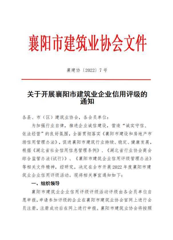 附件1:2022年 7號 關于開展襄陽市建筑業企業信用評級的通知.pdf
