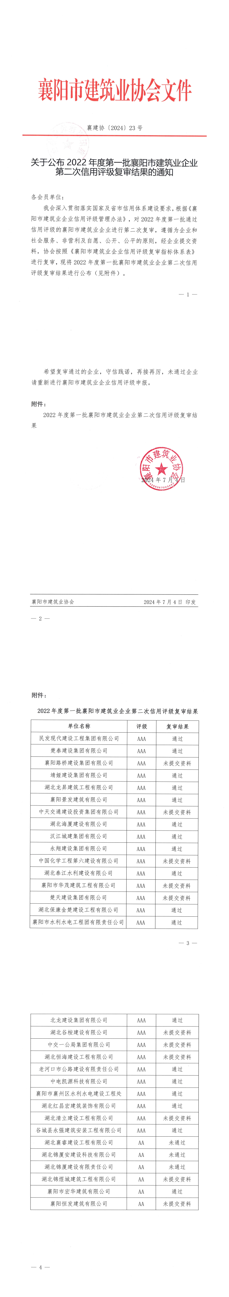 關于公布2022年度第一批襄陽市建筑業企業第二次信用評級復審結果的通知