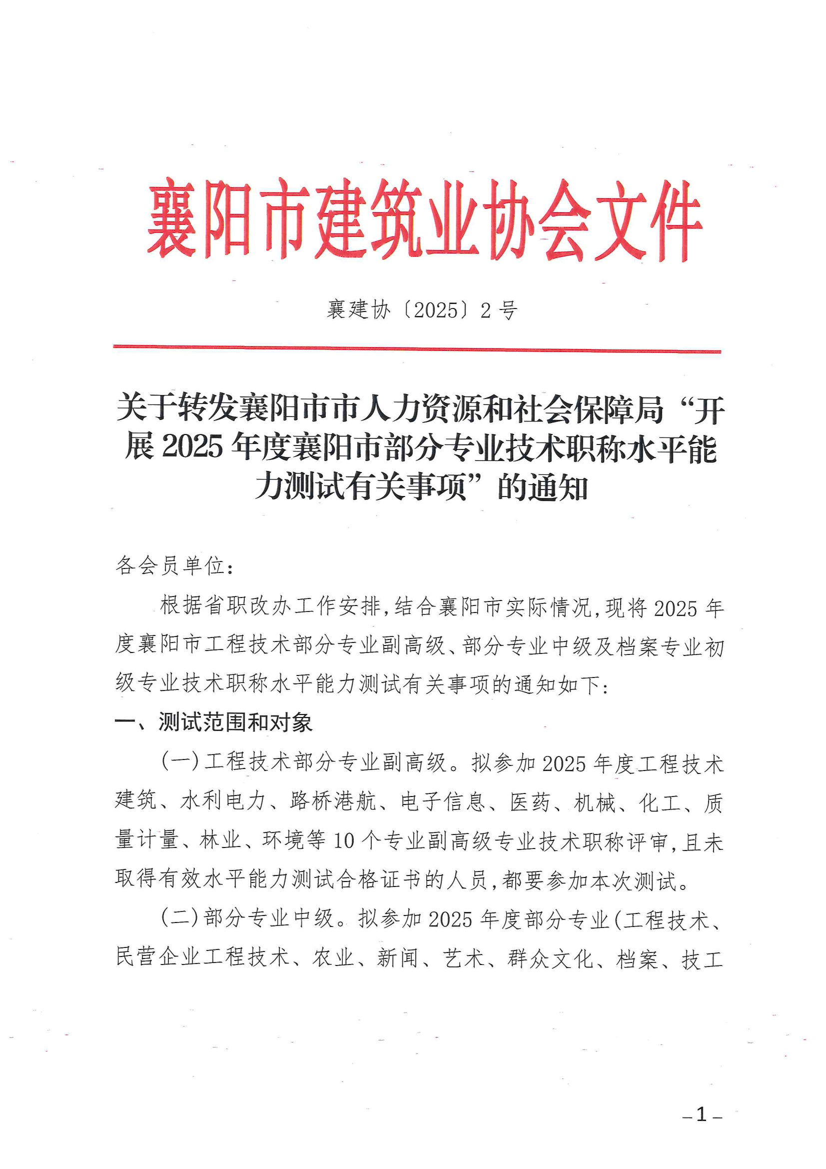 關于轉發襄陽市市人力資源和社會保障局“開展2025年度襄陽市部分專業技術職稱水平能力測試有關事項”的通知