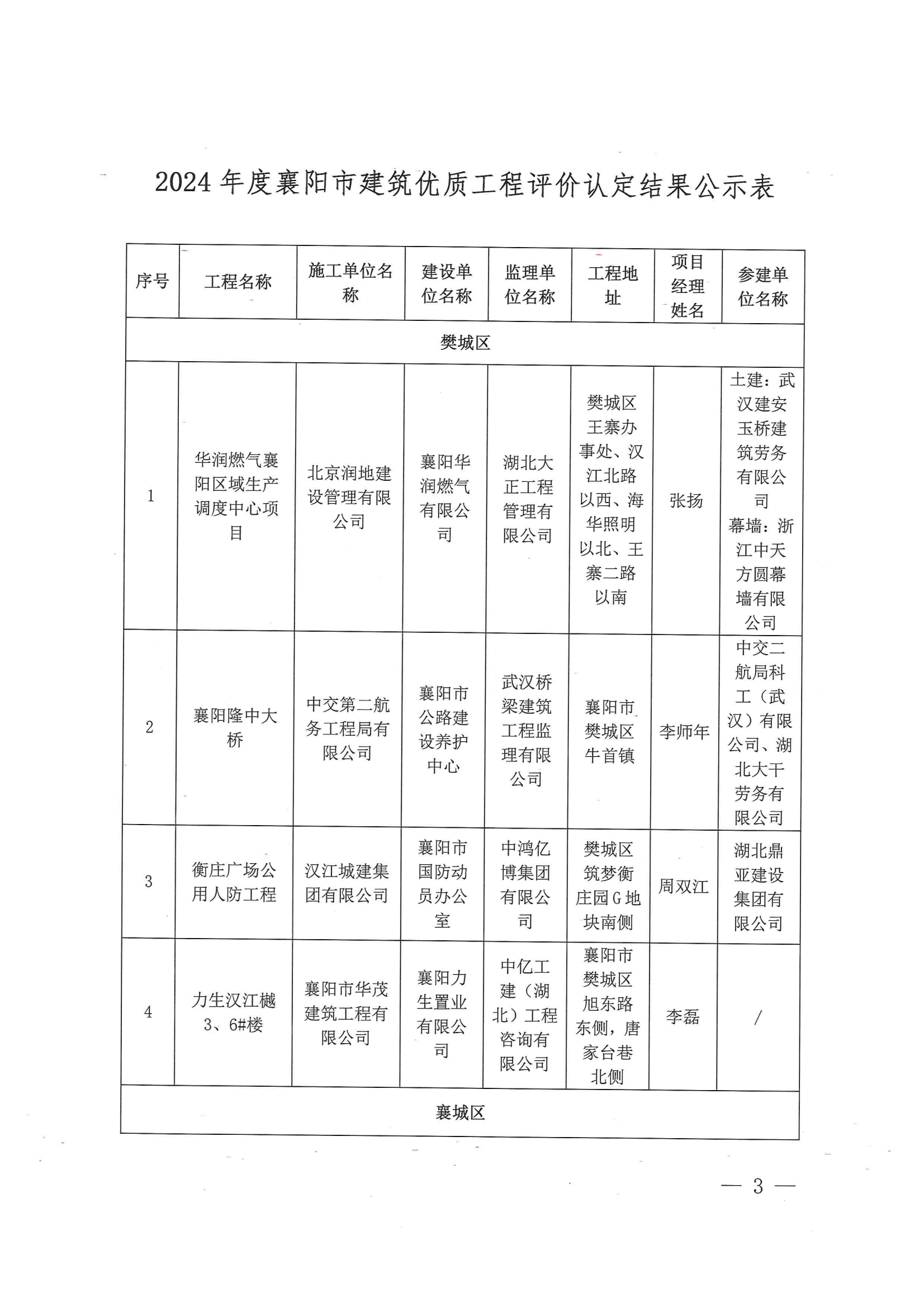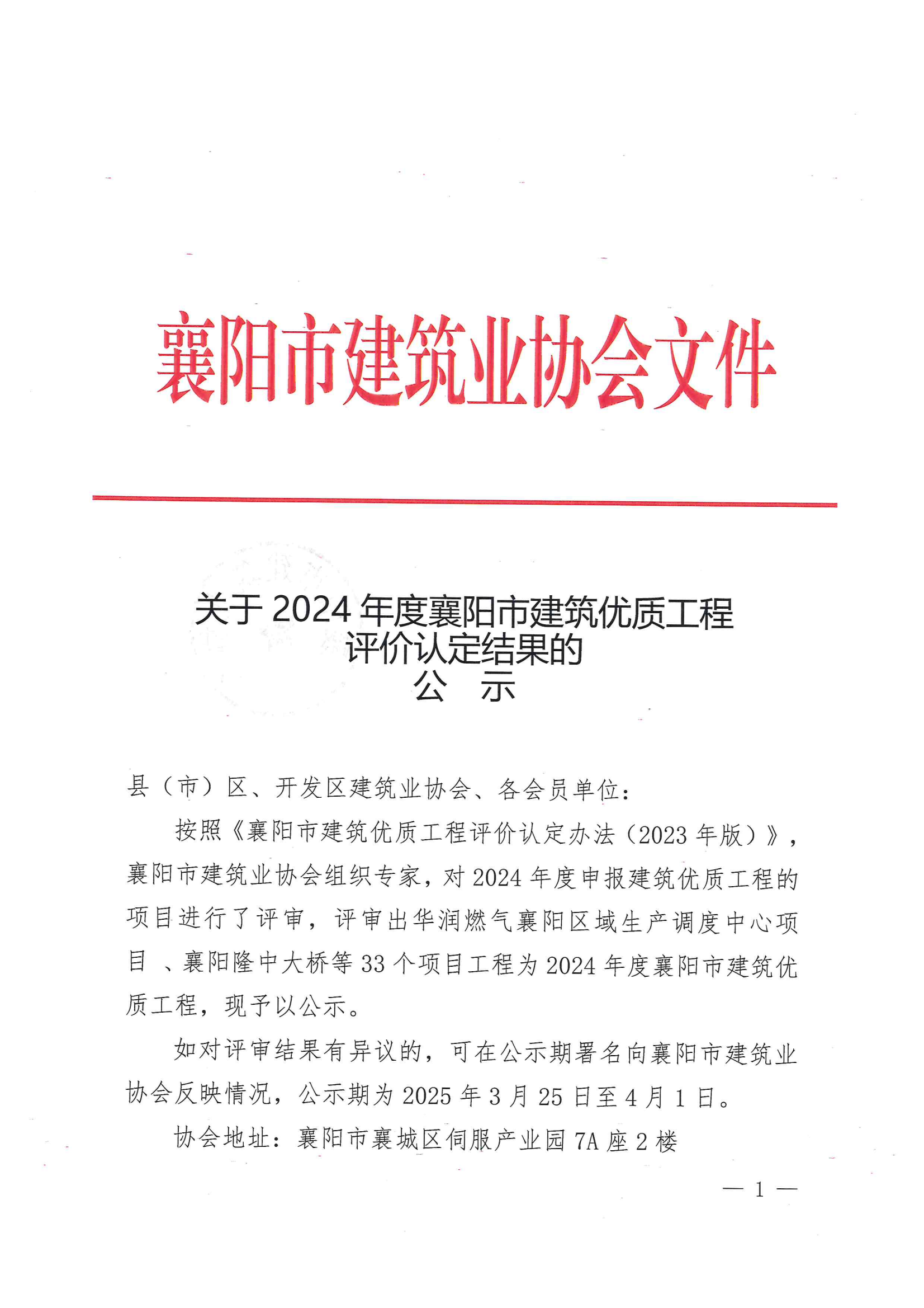關(guān)于 2024 年度襄陽市建筑優(yōu)質(zhì)工程評價認(rèn)定結(jié)果的公示
