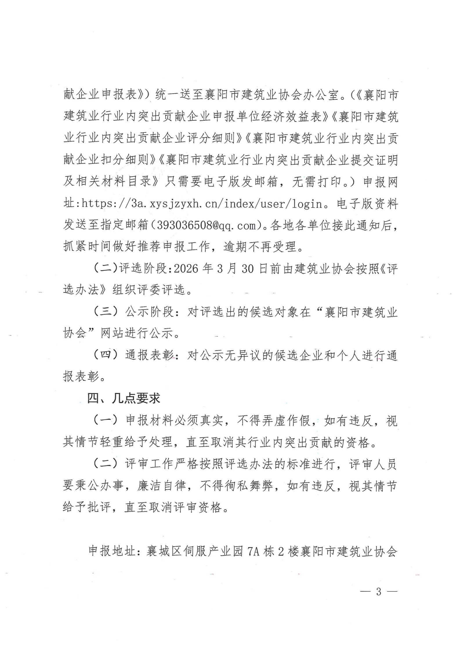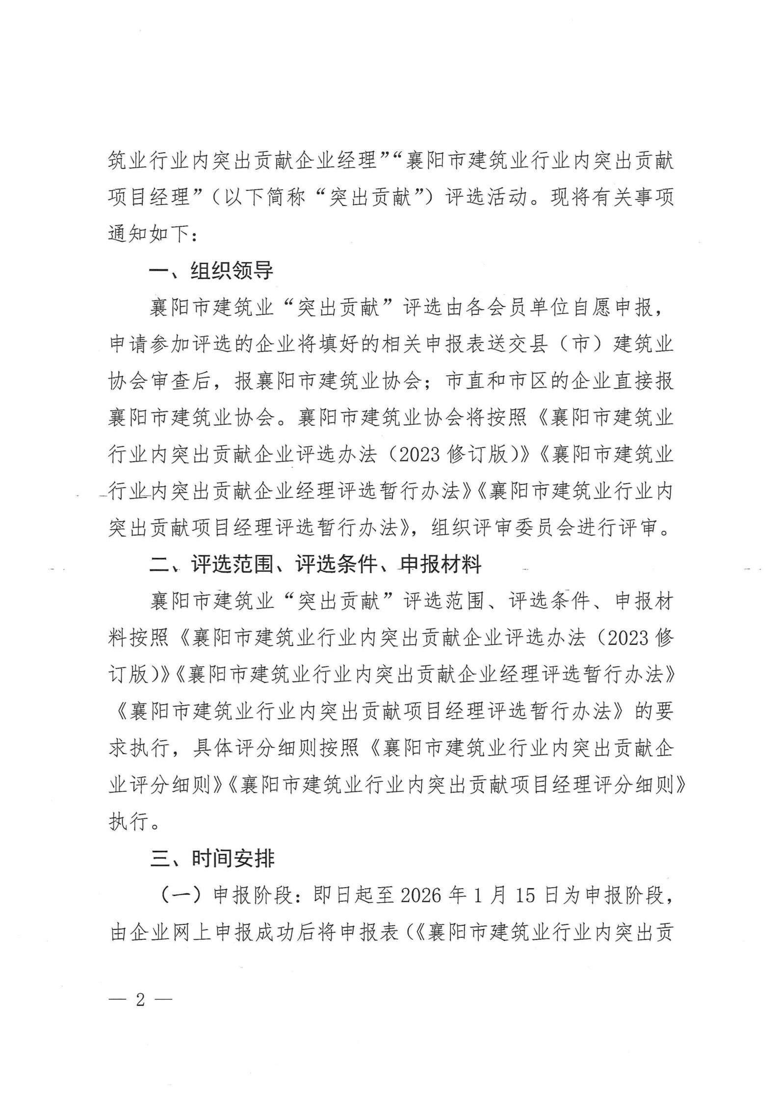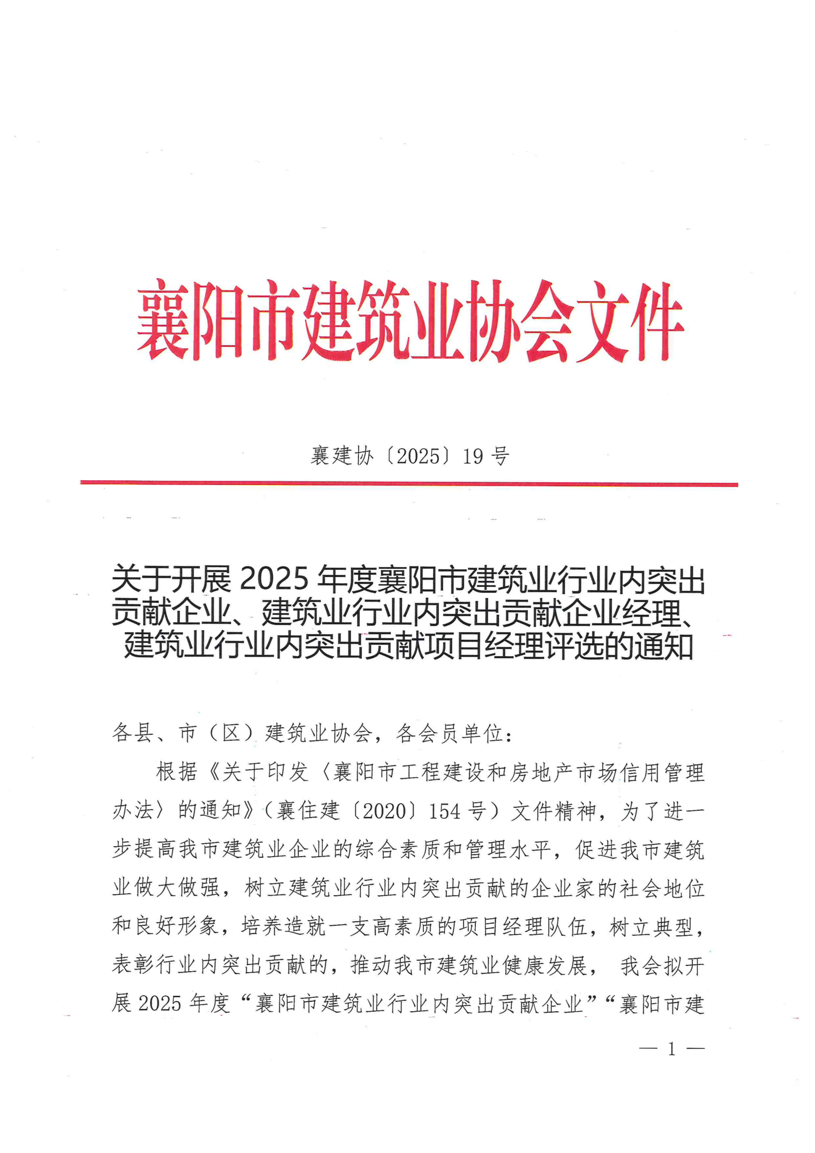 關(guān)于開展 2025 年度襄陽市建筑業(yè)行業(yè)內(nèi)突出貢獻企業(yè)、建筑業(yè)行業(yè)內(nèi)突出貢獻企業(yè)經(jīng)理建筑業(yè)行業(yè)內(nèi)突出貢獻項目經(jīng)理評選的通知