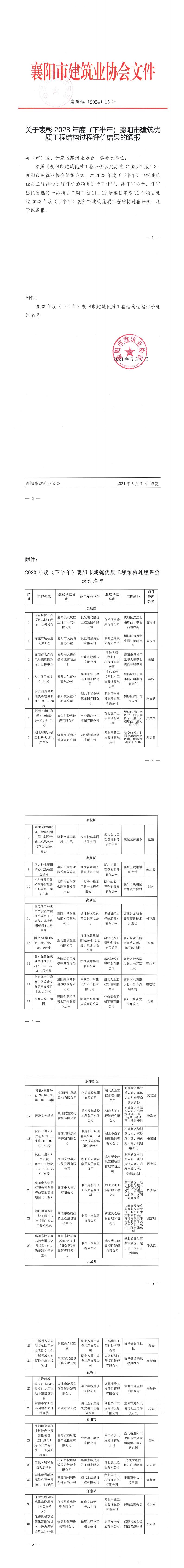 襄建協〔2024〕15號 關于表彰2023年度(下半年)襄陽市建筑結構優質工程評審結果的通報
