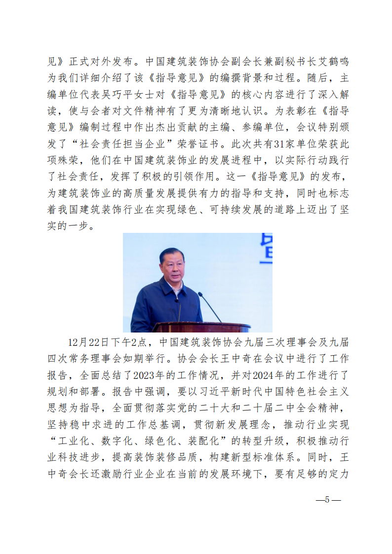 12月22日下午2點,中國建筑裝飾協會九屆三次理事會及九屆四次常務理事會如期舉行。協會會長王中奇在會議中進行了工作報告,全面總結了2023年的工作情況,并對2024年的工作進行了規劃和部署。報告中強調,要以習近平新時代中國特色社會主義思想為指導,全面貫徹落實黨的二十大和二十屆二中全會精神,堅持穩中求進的工作總基調,貫徹新發展理念,推動行業實現“工業化、數字化、綠色化、裝配化”的轉型升級,積極推動行業科技進步,提高裝飾裝修品質,構建新型標準體系。同時,王中奇會長還激勵行業企業在當前的發展環境下,要有足夠的定力和耐心等待浪潮的到來;在上升期,則需要具備劈波斬浪的魄力和智慧。他指出,盡管行業發展仍面臨諸多困難和挑戰,但只有通過不斷努力和奮斗,才能克服艱難險阻,實現更加美好的未來。最后,王中奇會長強調,行業企業應主動服務黨和國家工作大局,以滿足人民日益增長的美好生活需要為出發點和落腳點,要深刻把握行業發展方向,增強發展韌性,為中國式現代化建設貢獻建筑裝飾行業力量,為實現中華民族偉大復興作出新的更大貢獻。