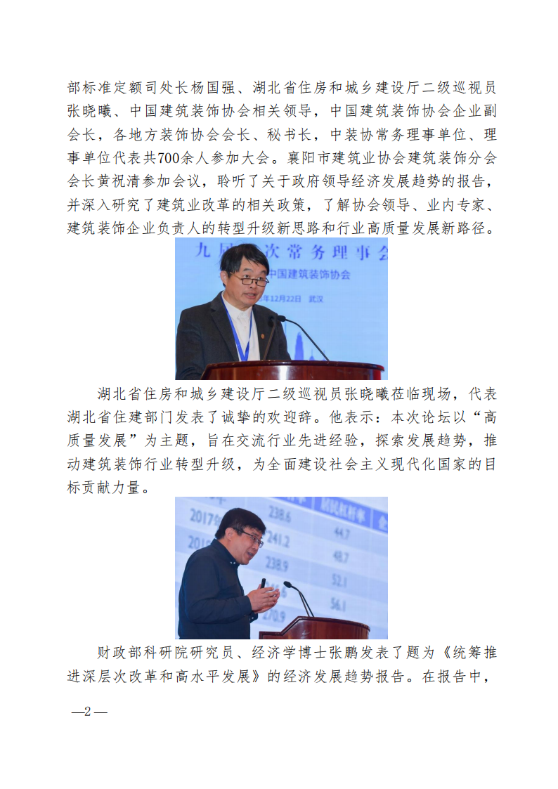 12月22日,中國建筑裝飾協會舉辦的中國建筑裝飾行業高質量發展論壇暨中國建筑裝飾協會九屆三次理事會、九屆四次常務理事會在武漢成功召開。住建部建筑市場監管司楊光處長、住建部標準定額司處長楊國強、湖北省住房和城鄉建設廳二級巡視員張曉曦、中國建筑裝飾協會相關領導,中國建筑裝飾協會企業副會長,各地方裝飾協會會長、秘書長,中裝協常務理事單位、理事單位代表共700余人參加大會。襄陽市建筑業協會建筑裝飾分會會長黃祝清參加會議,聆聽了關于政府領導經濟發展趨勢的報告,并深入研究了建筑業改革的相關政策,了解協會領導、業內專家、建筑裝飾企業負責人的轉型升級新思路和行業高質量發展新路徑。