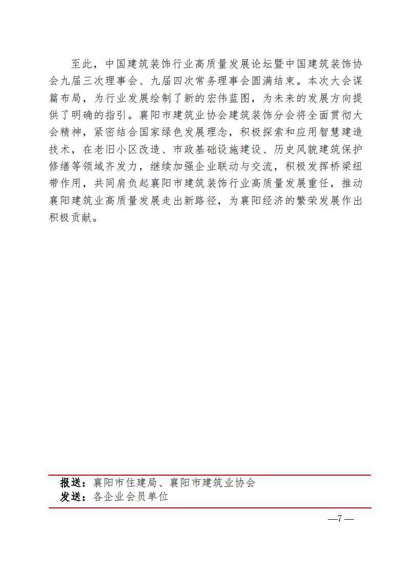 至此,中國建筑裝飾行業高質量發展論壇暨中國建筑裝飾協會九屆三次理事會、九屆四次常務理事會圓滿結束。本次大會謀篇布局,為行業發展繪制了新的宏偉藍圖,為未來的發展方向提供了明確的指引。襄陽市建筑業協會建筑裝飾分會將全面貫徹大會精神,緊密結合國家綠色發展理念,積極探索和應用智慧建造技術,在老舊小區改造、市政基礎設施建設、歷史風貌建筑保護修繕等領域齊發力,繼續加強企業聯動與交流,積極發揮橋梁紐帶作用,共同肩負起襄陽市建筑裝飾行業高質量發展重任,推動襄陽建筑業高質量發展走出新路徑,為襄陽經濟的繁榮發展作出積極貢獻。