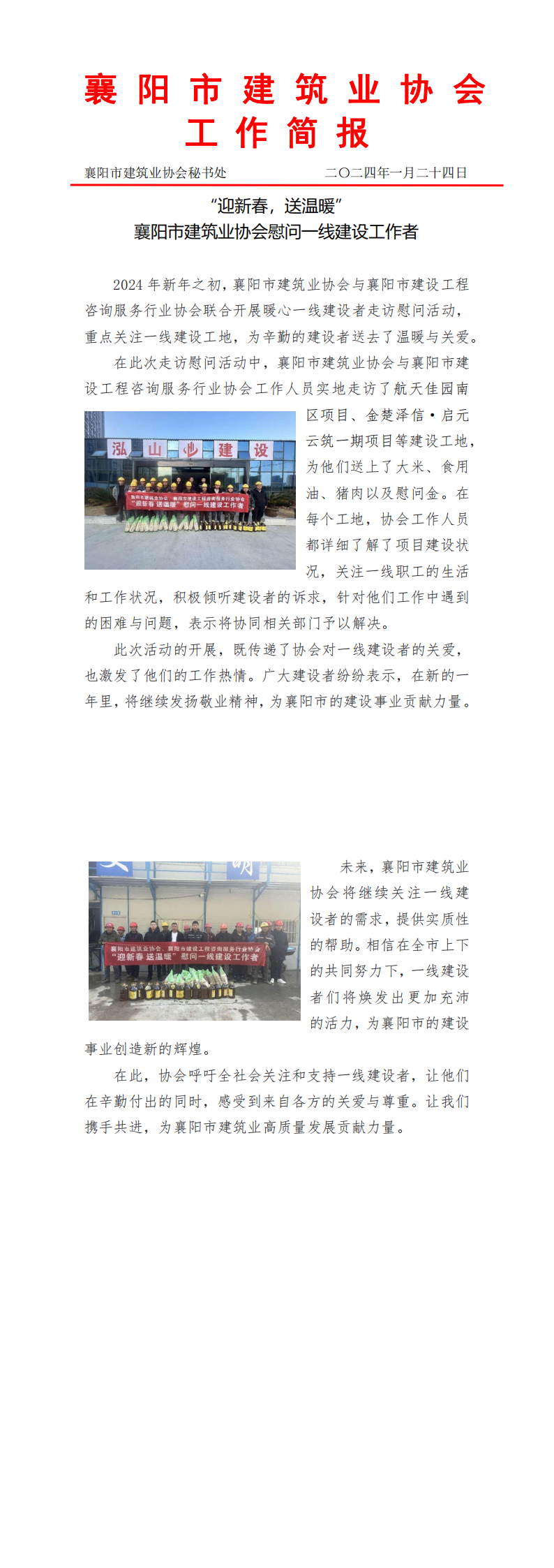 2024年新年之初,襄陽市建筑業協會與襄陽市建設工程咨詢服務行業協會聯合開展暖心一線建設者走訪慰問活動,重點關注一線建設工地,為辛勤的建設者送去了溫暖與關愛。