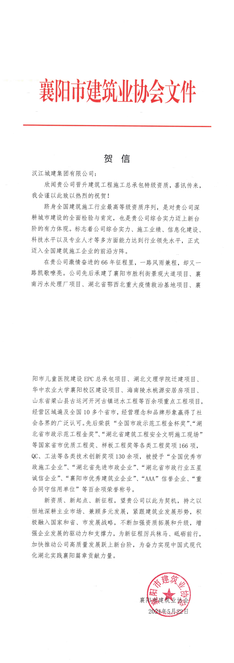 新資質(zhì)、新起點(diǎn)、新征程,望貴公司以此為契機(jī),持之以恒地深耕主業(yè)市場(chǎng)、兼顧多元發(fā)展,緊跟建筑業(yè)發(fā)展形勢(shì),積極融入國(guó)家和省、市發(fā)展戰(zhàn)略,不斷加強(qiáng)資質(zhì)拓展和升級(jí),增強(qiáng)企業(yè)發(fā)展的驅(qū)動(dòng)力和支撐力,為新征程厲兵秣馬、砥礪前行,加快推動(dòng)公司高質(zhì)量發(fā)展躍上新臺(tái)階,為奮力實(shí)現(xiàn)中國(guó)式現(xiàn)代化湖北實(shí)踐襄陽(yáng)篇章貢獻(xiàn)力量。